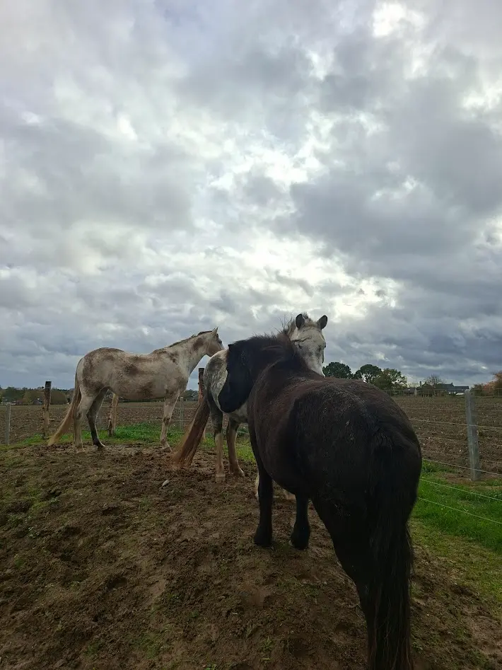 In het verlengde daarvan, voelen de paarden zich het veiligst in het achterste deel van de PP, omdat ze hier verder weg staan van lawaai en een open zicht hebben. Maar de moddervrije inrichting zit net in het voorste deel - gevolg: de paarden staan liever in de modder achteraan dan op de lava vooraan. Het idee was om het achterste deel af te sluiten als het natter werd, maar dat hebben we nog niet gedaan omdat de paarden net liever in dat deel staan.