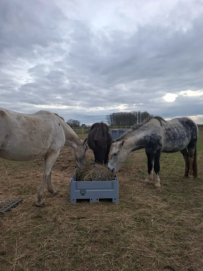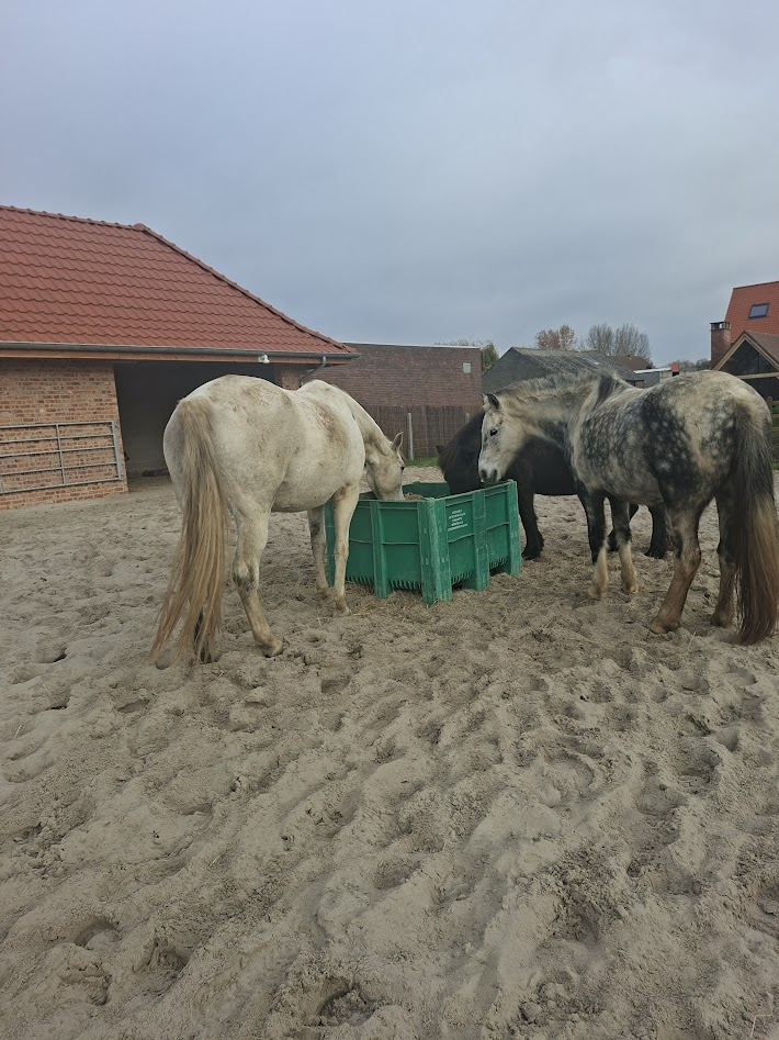 Met los hooi en verrijking proberen we de paddock en stal een fijne plek te maken, zodat de paarden zich daar comfortabel voelen om te schuilen.